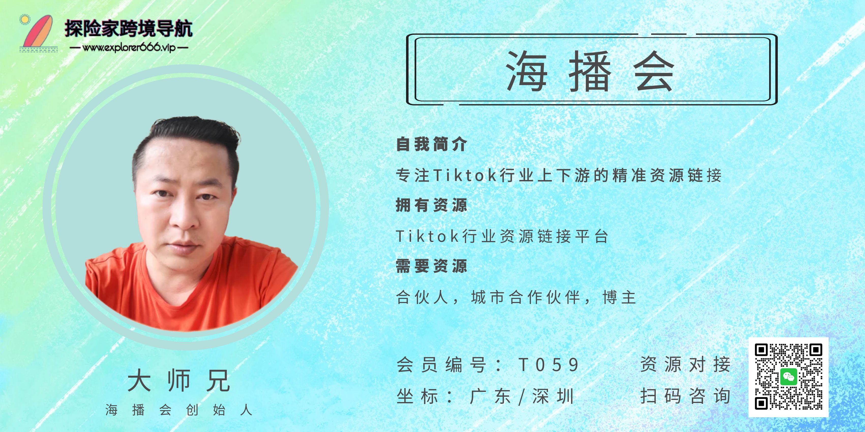 自我介绍:海播会科技有限公司,专注Tiktok行业上下游的精准资源链接,2023年赋能3万个会员出海,抱团取暖,联盟出海